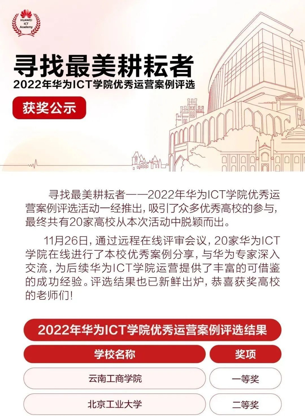 近日,“寻找最美耕耘者——2022年华为ICT学院优秀运营案例”中国评选活动落幕。评选中,云南工商学院荣获全国唯一一个一等奖。