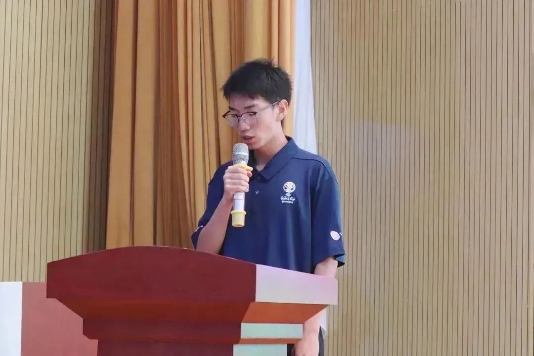 志愿者代表郭骁颉发言:无论是体育强国还是健康中国的目标,都离不开一代代人的积累与坚持。这个活动自2012年启动以来,解决了乡村学校师资力量不足的问题,姚基金以体育人,坚信体育拥有改变世界的力量和改变人生的魅力,它把篮球带来的梦想与激情传递给更多的人,引领我们积极融入社会,作为志愿者的我们,应严格要求自己,高质量完成好各项任务。